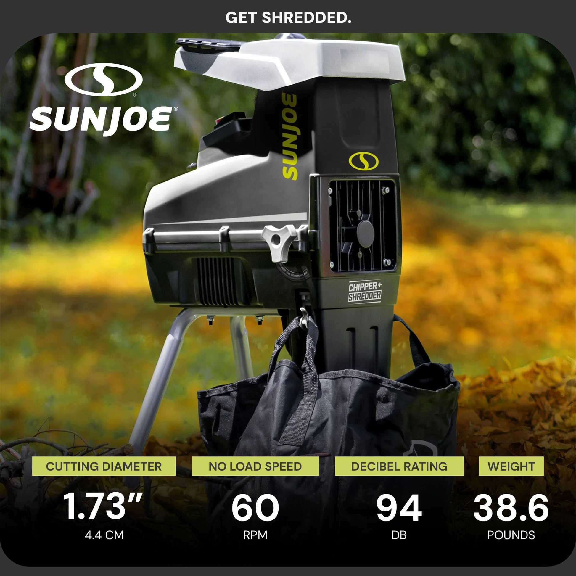 Sun Joe CJ603E Corded Wood Chipper and Shredder with 15A Electric Motor, 1.7-Inch Cutting Diameter, Includes Safety Hopper, Feeding Paddle, and Collection Bag
